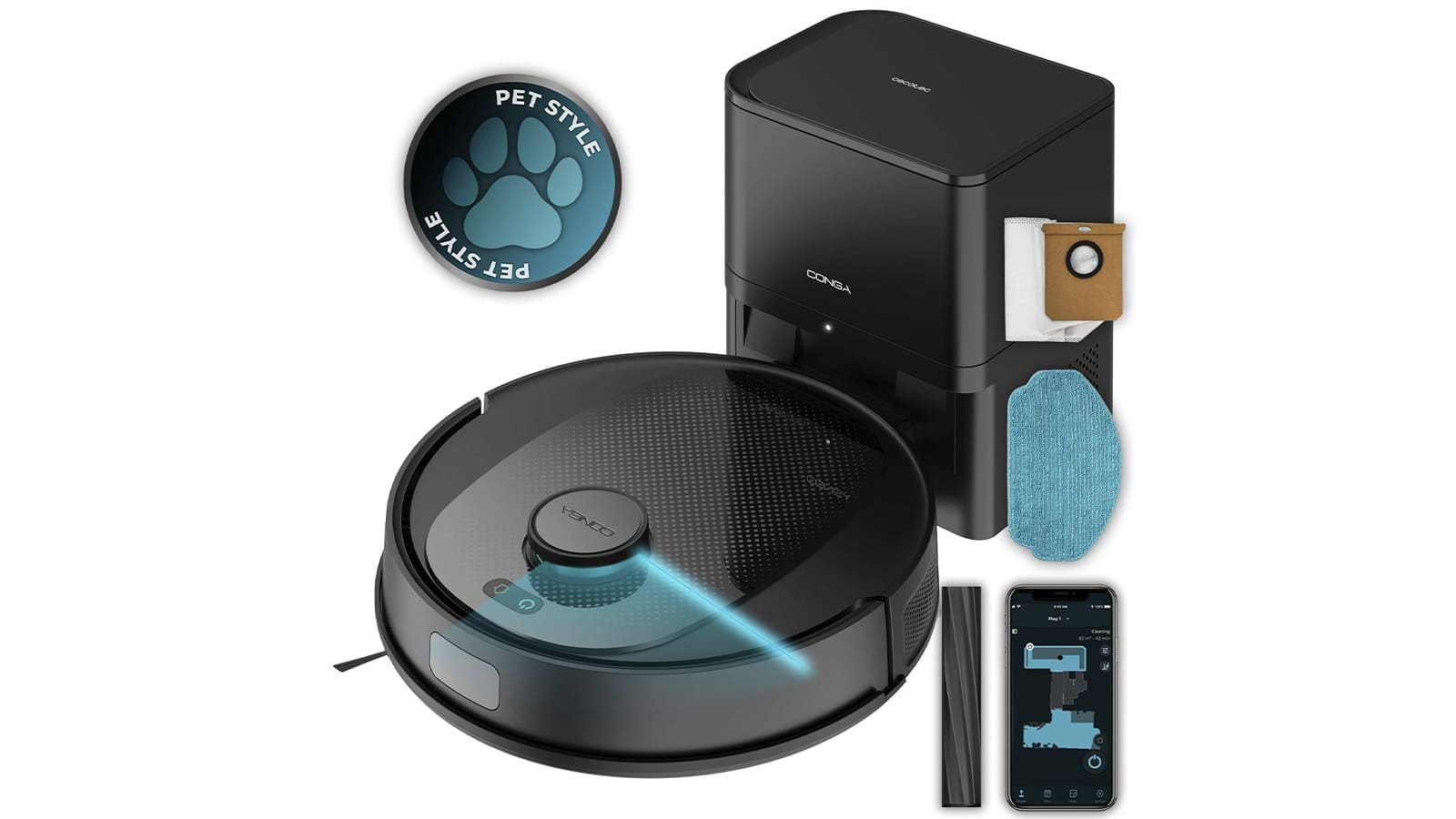 Особливості | Для прибирання шерсті тварин та волосся, З потужним акумулятором, Що говорить, Станція самоочищення, Площа прибирання на 100 м2 і більше, Преміум |